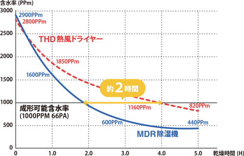 さらに熱⾵ドライヤーより、約2時間早く成形可能な⽔分量まで除湿乾燥でき、⽣産性アップに貢献します。