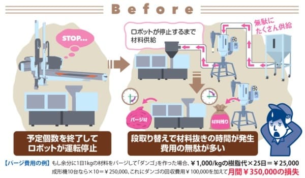 成形終了に合わせ、材料供給を最小限になるように自動計算して停止