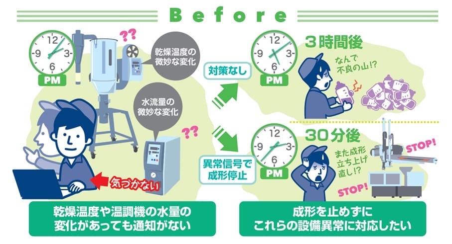 トータルリンクは射出成形の周辺機器と繋がり、モニタリングすることでこれまで人がチェックしていた進捗管理や監視を自動で行うことができます。