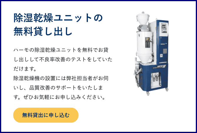 樹脂成形の品質を向上させ、不良率を改善するには湿度・乾燥を徹底管理する必要があると考え、ハーモの除湿乾燥機の導入を提案。結果、10%ほどあった不良率を0〜3%に激減させることができた事例をご紹介します。